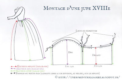 Il faut tout d'abord mettre votre support de jupe sur votre mannequin: cul, paniers. Ensuite, on prend trois mesures (rouge, verte et violet sur le schéma) de la taille à l'endroit où l'on veut que l'ourlet de la jupe s'arrête (le sol, la cheville, etc.). En ce qui nous concerne, ça a été assez court, puisque la robe à la polonaise est une robe courte. Ceci à trois endroits différents: devant, sur un côté et au dos. On y rajoute de quoi faire l'ourlet (au moins 4 cm). Vous avez ainsi trois hauteurs.